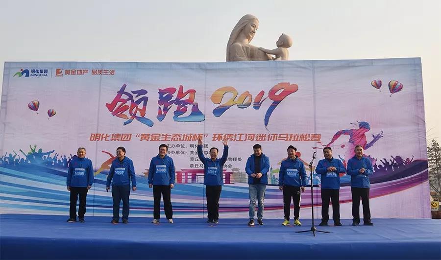 绣江河畔,清照故里。2019年1月1日,明化集团联合黄金生态城、章丘区绣江河公园管理处、章丘马拉松运动协会,共同举办“领跑2019!明化集团‘黄金生态城杯’环绣江河迷你马拉松比赛”。明化集团健跑团、明化义工爱心基金同时启动。明化集团董事长孙洪海、常务副总殷传光、党委副书记仇健、副总经理郭彦超、副总经理孙志田、山东黄金生态城常务副总经理齐欣、章丘马拉松运动协会秘书长张润涛、绣江河公园管理处主任李荣立及集团团员青年、各单位跑步爱好者、章丘马拉松运动协会成员,共近400人参加。
