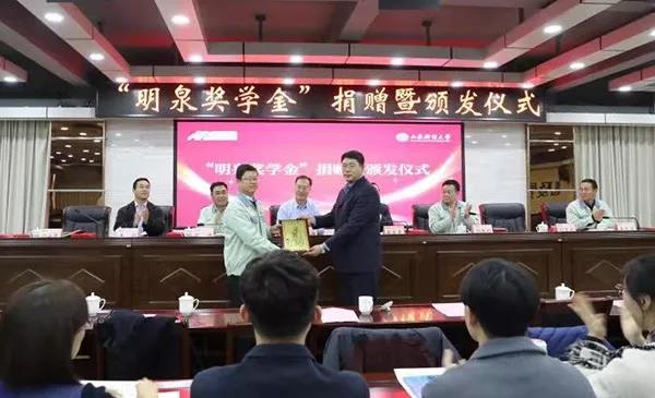 仇健代表集团向山东财经济大学捐赠奖学金,刘旻航代表山东财经大学向集团赠送纪念品。王剑宣读了2019年“明泉奖学金”获奖学生名单,50名获奖学生领取奖学金。本年度、往年获奖学生代表分别作表态发言。