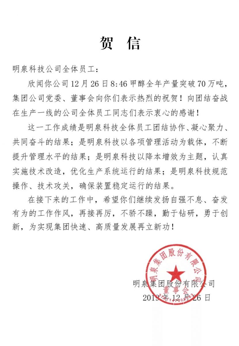 2019年12月26日上午8:46,明泉科技主控室FIQ3311-B流量表清晰显示“700000.000”,系统粗醇产量累计达到70万吨,超出年生产65万吨的任务目标,提前向集团交上了一份华丽的答卷。