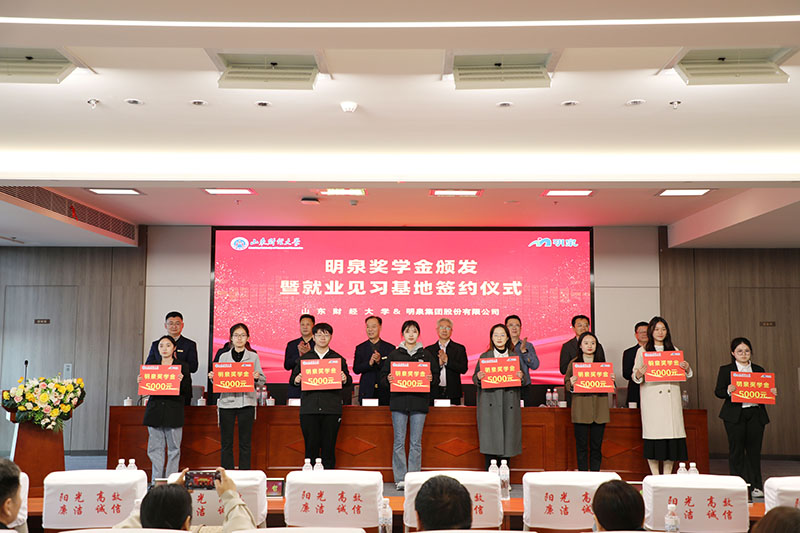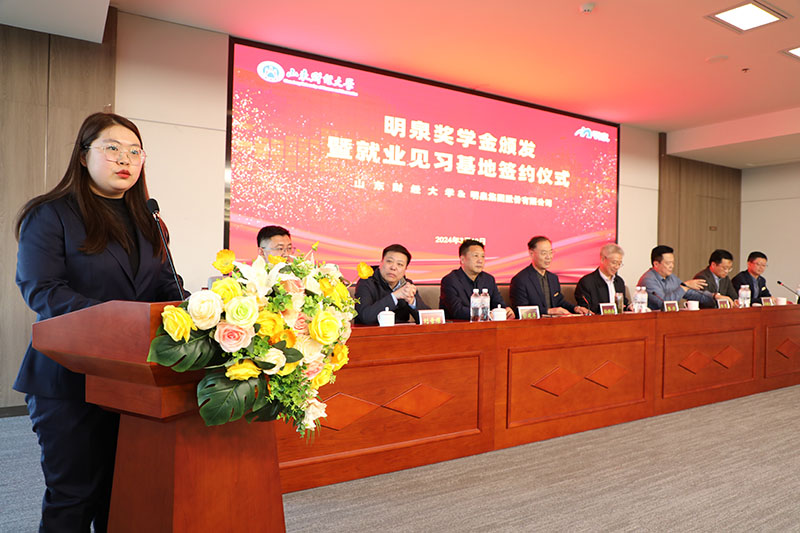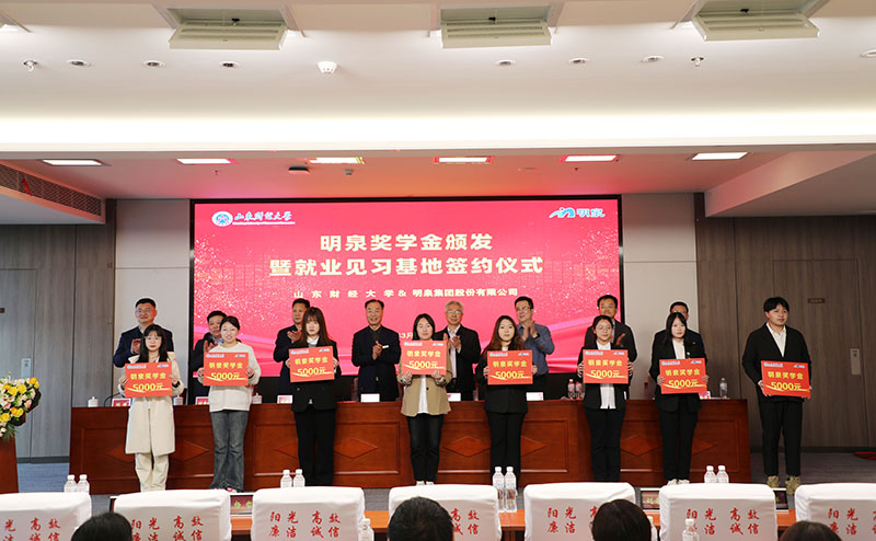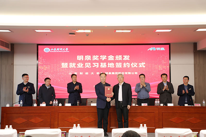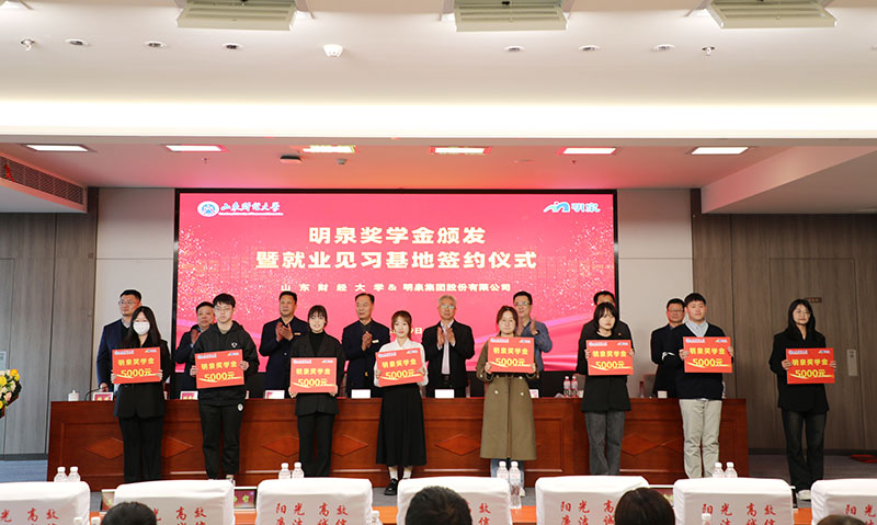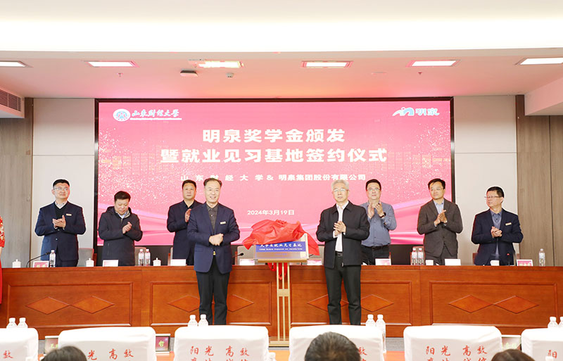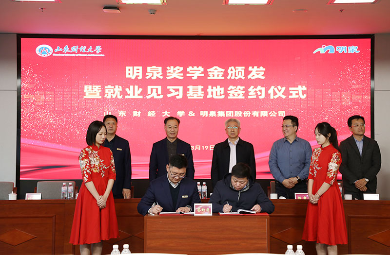 3月19日下午,“校企合作促发展,协同育人谱新篇”明泉奖学金颁发暨就业见习基地签约仪式在明泉大厦二楼多功能会议室举行。山东财经大学副校长张新、党委学生工作部部长杨哲、就业指导处处长刘奇耀、团委书记王晓迪,时博在线平台党委书记、董事局主席孙洪海,党委副书记彭建军、人力资源中心主任刘洋、集团董事局办公室副主任付安平出席仪式。山东财经大学师生、明泉青年员工代表参加仪式。
