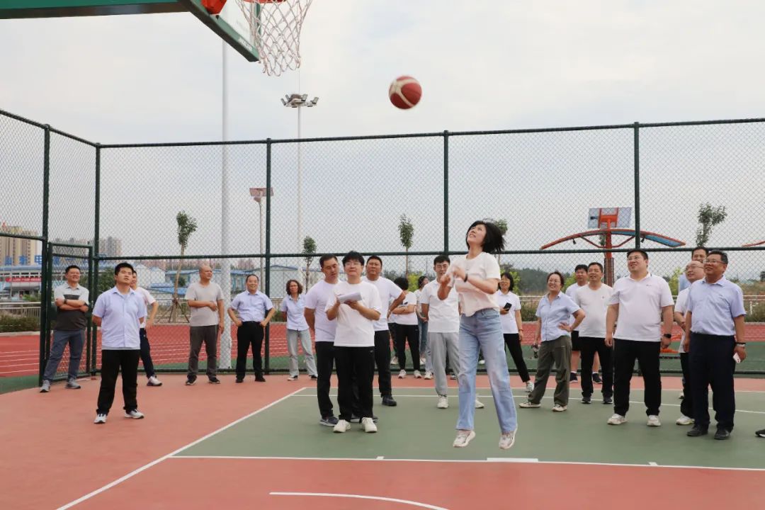 彭建军宣布明泉大厦体育场正式启用,操场内五颜六色的气球腾空而起,趣味运动会拉开帷幕。