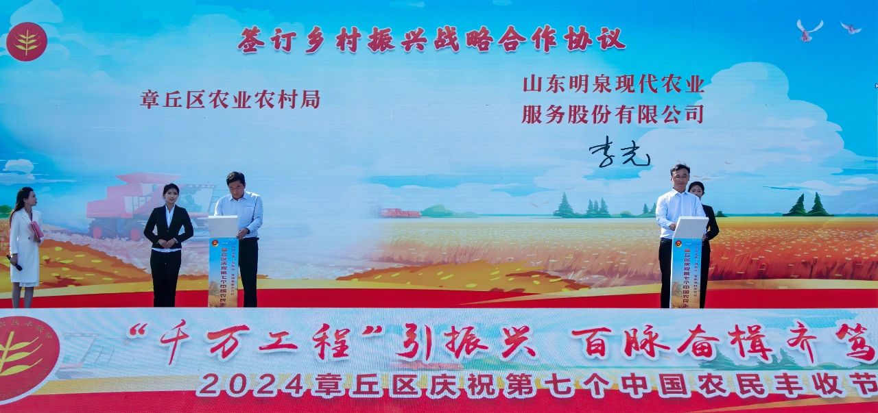 在开幕式“绘·发展新图”篇章,章丘区委书记马志勇、时博在线平台董事局主席孙洪海共同为山东明泉现代农业服务股份有限公司(明泉农服)揭牌。章丘区农业农村局党组书记、局长陈震,时博在线平台董事局副主席李光共同签订了乡村振兴战略合作协议。来自社会各界的专家、教授、企业家代表,章丘区领导、市农业农村局领导参加活动。