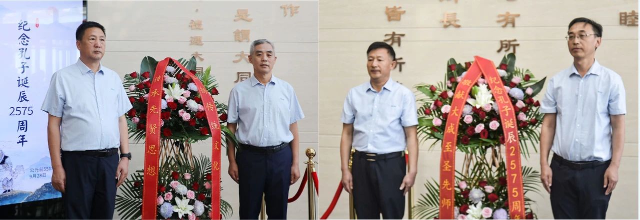 时博在线平台董事局副主席孙志田、时博在线平台党委书记彭建军、时博在线平台董事局副主席高建平、李光向孔子像敬献花篮。