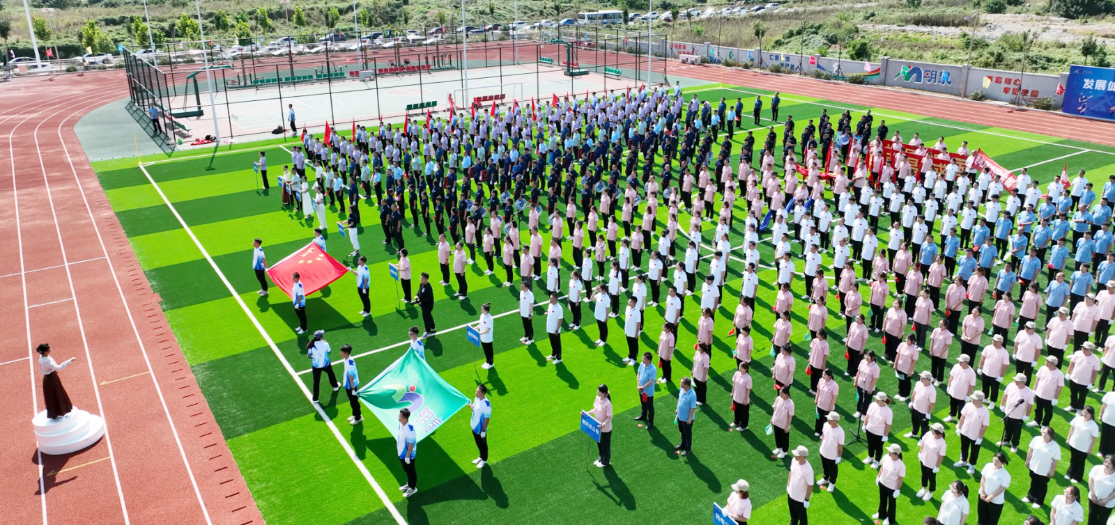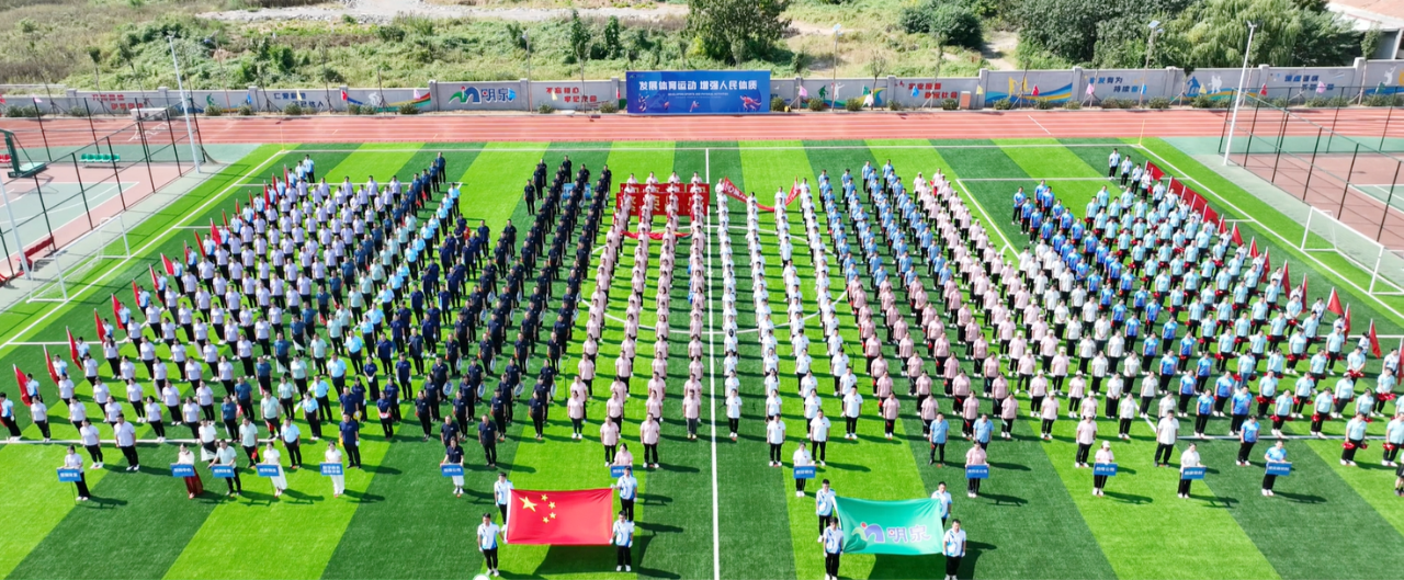 入场式后,全场齐唱《国歌》,庄严洪亮的歌声在运动场内回荡,表达了明泉人对伟大祖国的无比热爱和对祖国75周年华诞的美好祝愿。