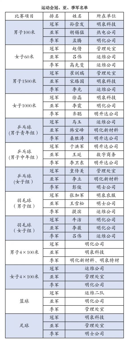 本次运动会的举办得到了集团领导及各公司的鼎力支持,员工们积极报名、踊跃参加,在赛场上奋勇拼搏,挥洒激情,认真完成每一场比赛,充分展示了在集团迈向二次转型发展新阶段,广大员工凝心聚力、众志成城、永争第一、自强不息的良好精神风貌。全体明泉人将继续推动基础产业板块巩固、优化、提升、可靠,高新产业板块创新、创造、开发、开拓,用更加饱满的热情、更加强健的体魄、更加高效的工作,为集团的高质量发展贡献力量。