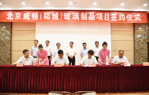 7月30日8:18,北京威顿(郓城)玻璃制品有限公司项目签约仪式在郓城县举行。菏泽市副市长任仲义、郓城县委书记刘文林,中国日用玻璃协会理事长孟令彦、北京一轻总经理阮忠奎、郓城县委县政府领导班子级相关部门领导、公司董事长孙洪海、党委副书记仇健及鲁发化工、正华玻璃负责人参加仪式。